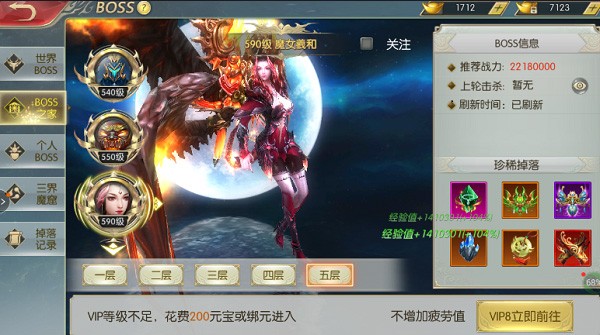 如果你觉得世界BOSS的疲劳度限制太麻烦,那么BOSS之家是一个不错的选择。BOSS之家的掉落非常丰富,是获取高阶装备的好地方~BOSS之家需要VIP4才能进入,但其丰富的掉落绝对值得