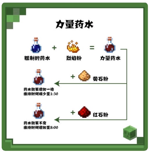 力量药水和治疗药水是粗制的药水分别加上烈焰粉和闪烁的西瓜,再次加入萤石粉和红石对应的效果也会发生相应的变化,值得一提的是治疗药水在加入发酵蛛眼之后会变成伤害药水~