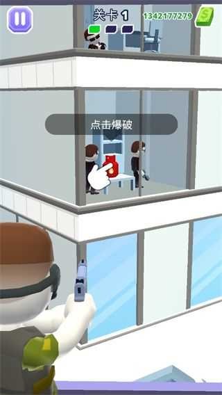 2、进入游戏后,你将置身于一架直升机上,任务是消灭大楼内的犯罪分子。点击屏幕即可射击犯罪分子。