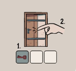 根据书中的提示得知盒子的开法,输入和花盆花纹对应的叶子数量,便可开启盒子,这时,你突然感到一阵心悸,似乎有人站在你的身后。片刻,你觉察到那个人离开了,你往盒子里看去,里面是火柴和相片:周一上午十一点零三分,他在盯着我。用火柴点燃蜡烛,用它照亮脚下的老鼠洞,看见了里面的插头,用雨伞把它勾出来吧。来到电视机旁,用钥匙打开柜子顶端的门,得到胶带。现在可以用胶带把插头和断掉的电视机电源线接起来了。按下电视机开关,并没有节目出现。你把录像带放入录像机中,屏幕出现了画面。那是一个长发女孩背对着摄像机,正往墙上画着什么。你看到两个圆,还有横线,类似时钟面板。画面里的门正是房门,旁边的矮柜上还放着旋钮,那是电视机上缺失的零件。你转身看向房门,却看到窗户处站着那个长发女孩,她像录像里一样背对着你,你想看个究竟,但她慢慢的消失了。房门旁的矮柜上不知何时已经出现了那个旋钮,拿走它,顺便用酒瓶里的钥匙打开抽屉,得到了绝缘手套。你把旋钮安到电视机上,突然灵感一现,按照录像中显示的把两个旋钮旋到画面里圆圈和横线对应的位置,得到一个把手。