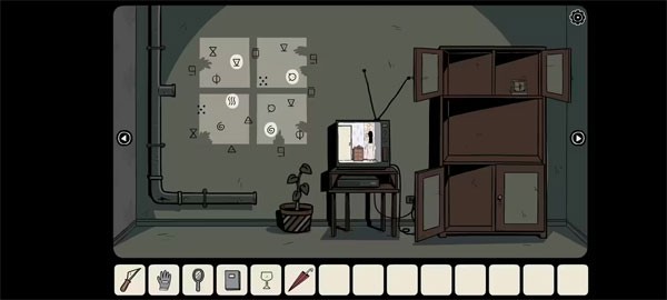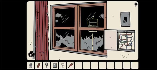 钥匙可以打开电视机旁大柜子底下的一扇门,得到玻璃碗。来到房门前,安上开关面板,可以打开或者关上屋中的电源了。现在关上电源,戴上绝缘手套去摆弄窗户边的电线,把它们接好后,按下上面的开关,屋外的强光灯开启了。你拉上窗帘,看到那上面有几个破孔,强光透过破孔照射在对面墙上,映出特定的几个符号。你看向那面墙,忽然一个黑影闪过吓了你一跳。墙上映出的符号结合书中的提示便是窗下密码锁的答案。就在你解锁时,一只手慢慢搭在了你的肩膀上,你一惊,转头看了看,却看到身后什么都没有。抽屉里是一根撬棍。
