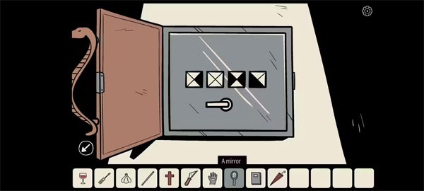 现在可以打开最后一扇柜门了,从里面得到一只螺丝刀,还有一瓶红酒。如今有了螺丝刀,便可以拆除吸血鬼画像画框上的螺丝钉了。就在两颗螺丝钉都掉落之后,突然你看到画中的事物变了,吸血鬼变成了那个留着长发的女孩,她的一只胳膊从画中伸出,想要抓住你。你下意识的用手挡住脸,但没有感觉到什么。你再次看向那幅画,并没有什么长发女孩,仍旧是那个吸血鬼。打开画,那后面是个图案迷题。你想到了告示板后面的大蒜十字架什么的,那些不就是和吸血鬼有关的东西吗?你按照顺序先拿出了大蒜,吸血鬼害怕地用披风挡住了脸,同时画上出现了右边三角是黑色的图案。下一个东西是杯子,空杯子对他没有效果,你把红酒倒了进去,再拿给吸血鬼,这时他的嘴角出现一抹红色,然后伸手在玻璃上画了个红红的X,这应该代表构成方块的四个三角都应该是白色的。下一个是十字架,画上出现了左右三角是黑色的图案。最后是镜子,它映不出吸血鬼的身影,于是画上只出现左边和下方三角是黑色的图案。把四个图案输入画后的迷题中,听见了正确的响声,拉动把手,露出了后面的开关。