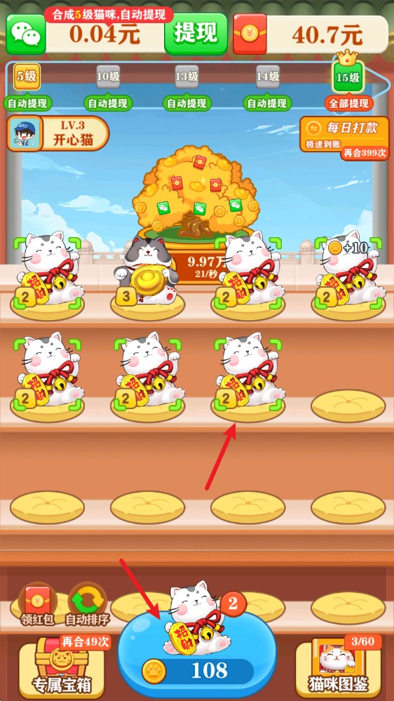 2、拖动相同的猫咪并重叠在一起,即可合成更高等级的猫咪。