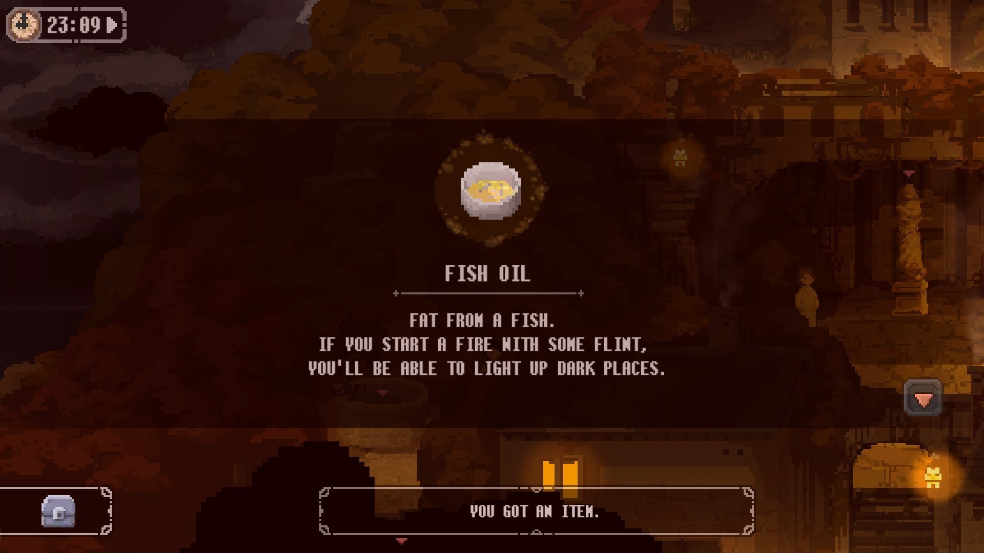 进去后,走到右边提示“光线不足”,点击背包里的鱼油,照亮道路。