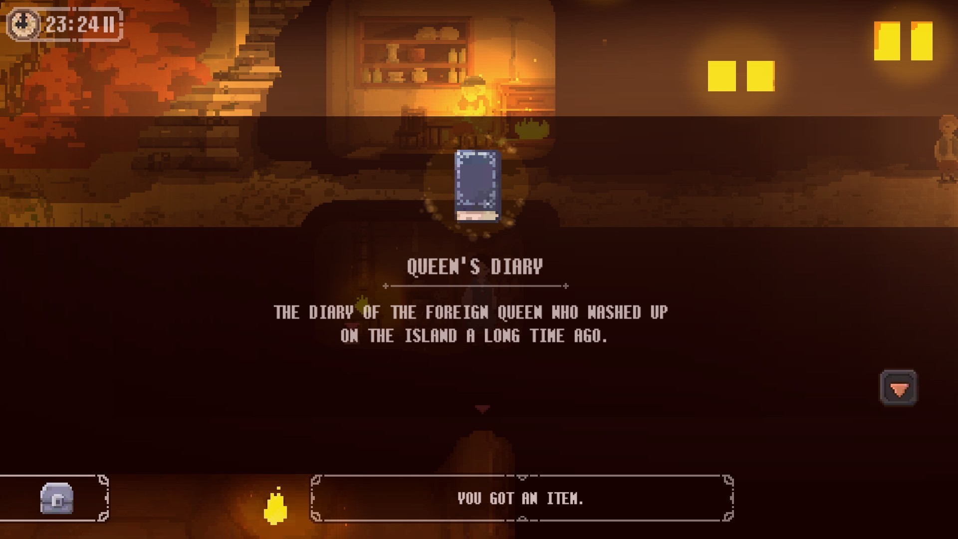 到此,皇后日记到手,点击背包里的皇后日记,点击翻页按钮看完,我们能够知道有些过去的事情。