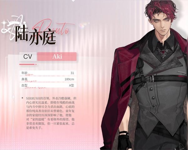 SIRRUSH的首领。外表冷酷强硬,但内心却无比温柔。即使在残酷的商战与内斗中拼尽全力杀出血路,心底的那份纯真善良依旧未曾褪色。童年复杂的家庭经历深深影响了他,使他对“家的温暖”有着格外的渴望。他非常喜欢做饭,但一旦紧张起来,总是难免失手。