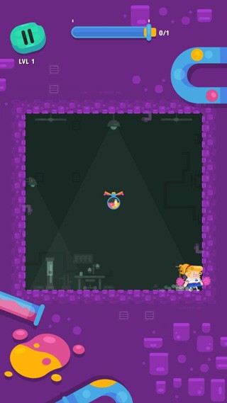 在第一关我们会看到我们被封闭在了一个正方形的空间里面。我们如果不去点击屏幕的话角色是会一直围着这个正方形绕圈的,在这个方形空间的正中间有一个带翅膀的小药瓶。我们要做的就是在每一个关卡里只要把关卡中存在的所有小药瓶拾取到就可以顺利过关了。