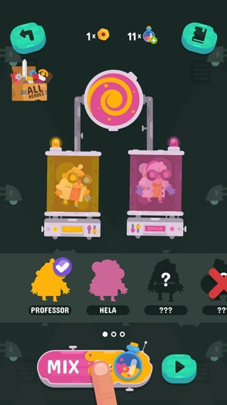 当闯完关后进入选择关卡的时候点击屏幕右上角的角色键,进入后你可以看到黄粉两个机器,只需要把屏幕下方的允许合成的两个人物拖动到上方的机器中点击MIX键就可以合成出新的人物了。